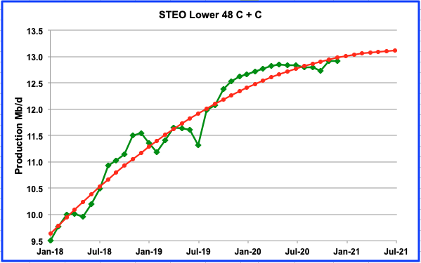 Above is a quadratic curve fit projection out to mid-2021 of the STEO L48 production data up to December 2020. The quadratic is giving a strong indication of a peak around the middle of 2021. The STEO data shows an intermediate peak in May 2020, which could be the high if the bump up from the GOM in November 2020 does not materialize. The September and October declines could be simply EIA guesstimates associated with hurricane interruptions.