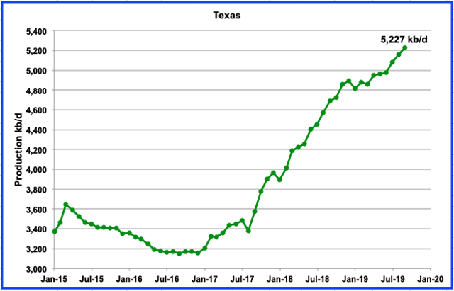 In September, Texas production continued to rise and rose by 72 kb/d to 5,227 kb/d. Again, comparing the initial growth estimate for Texas for 2019 vs. 2018 indicates a slower growth rate for 2019. In 2018, growth to September 2018 was 729 kb/d, while for 2019, it is 331 kb/d, ~45% of the 2018 growth rate.