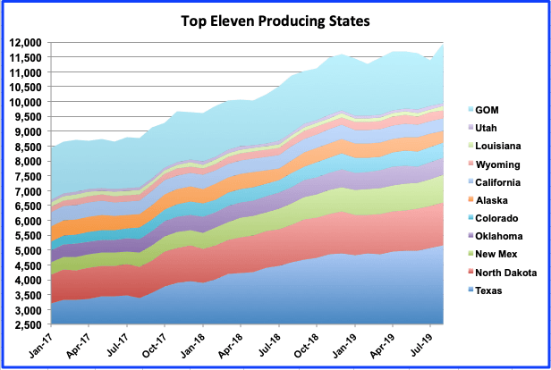 Listed above are the 10 states with production greater than 100 kb/d. These 10 account for 10,106 kb/d (81%) of total US production of 12,463 kb/d in September.