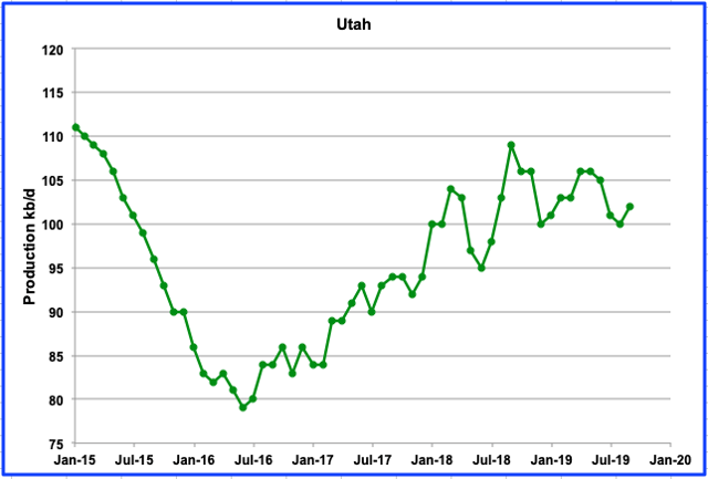 Oil production in Utah started to increase in 2016 after the discovery of a new conventional oil field. However, Utah’s production may now be entering a plateau period or declining phase.