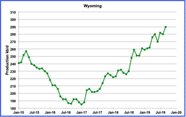 The northern portion of the Niobrara LTO basin is situated in Wyoming. The sharp increase in Wyoming production from January 2017 is directly related to increased drilling in the Niobrara. One year ago September, on average Wyoming had 30 rigs operating. As of September 2019, it has increased to 35. We should expect to see production increasing. However, in November, there are only 31 operating. It will be interesting to see if production decreases. For all of the Niobrara, September production increased by 9 kb/d. Wyoming by itself increased by 10 kb/d.
