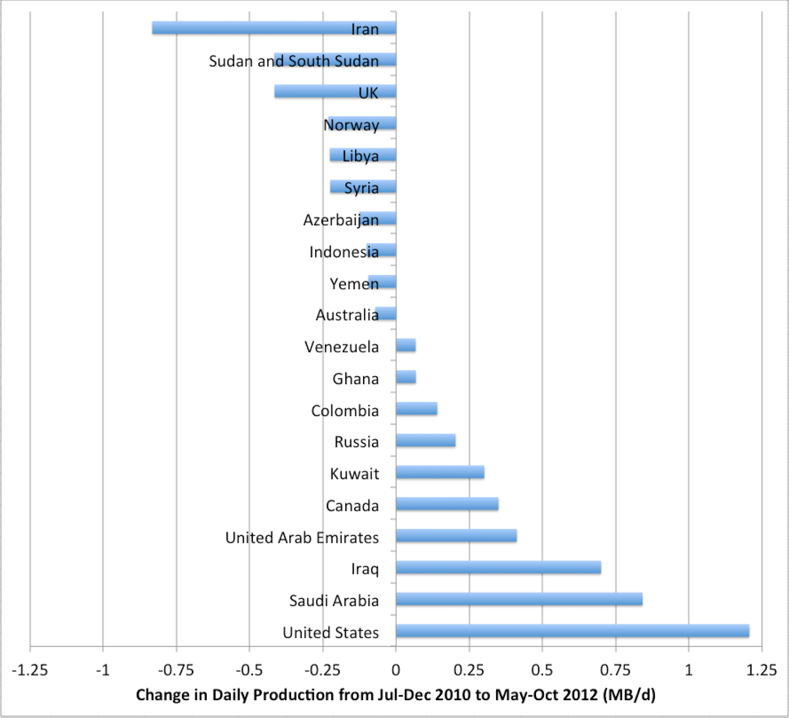 Basically, the big increases have come from the US tight oil boom (with an assist from Canada), and also from the reasonably stable countries in OPEC, which have been increasing production (principally Saudi Arabia, Iraq, UAE, and Kuwait). Â Meanwhile, the decreases have been coming from ongoing exhaustion-related declines in the North Sea (UK and Norway), together with a variety of political problems around the globe (sanctions on Iran, instability in Sudan, Libya, and Syria).