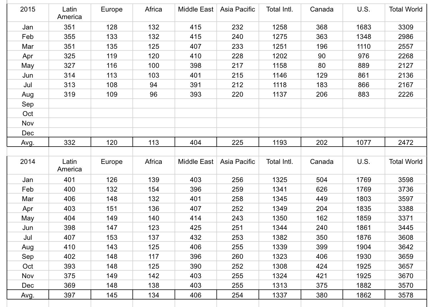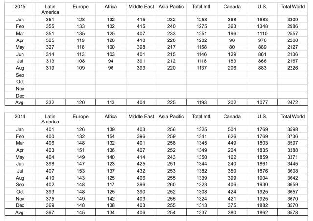 Outside of the U.S. and Canada, rig count has dropped as well. After seeing five straight years of year-over-year growth, the international rig count (excluding these two countries) has finally taken a beating, falling from 1,339 in August of last year to 1,137 today. Every region profiled by Baker Hughes (NYSE:BHI) has shown a drop over this timeframe, with Latin America being hit the hardest. During this period, the region watched its total rig count drop from 410 to 319. Unfortunately, this data is not broken up between oil rigs and natural gas rigs, but it’s probably safe to assume that, just like the U.S. and Canada, both types have contributed to the downturn.