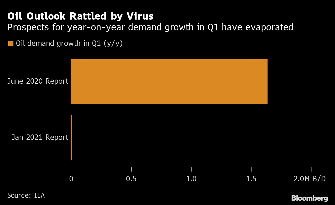 On Tuesday, the International Energy Agency slashed forecasts for world oil demand in the first quarter as countries hunker down to contain new coronavirus outbreaks. China, which has powered crude’s recovery until now, is locking down cities again and discouraging travel over the Lunar New Year holidays.