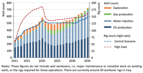 Figure 5. Number and types of wells needed in Iraq for the “Central Scenario” of production that the IEA projects. (IEA)