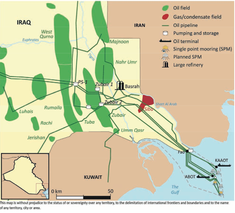 Figure 6. Actual and proposed infrastructure in Southern Iraq, showing the single point moorings. (IEA)