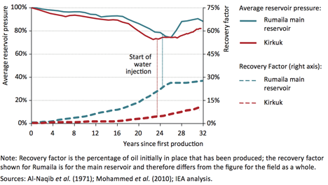 Figure 3. Reservoir pressure and recovery factors in two Iraq fields, before and after water injection began (IEA)