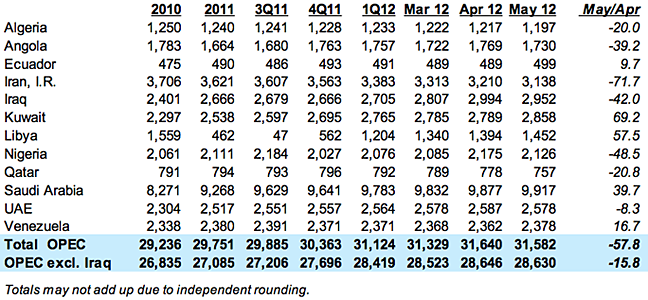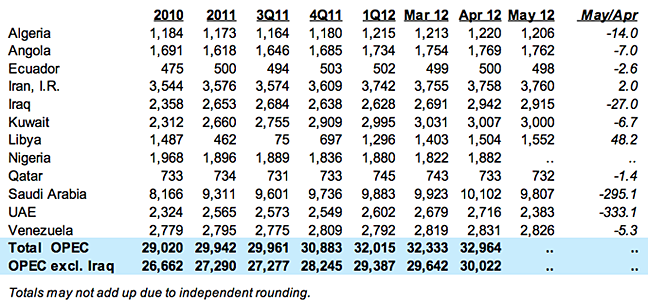 The three major oil producers (i.e. those producing more than 5 mbd each) are currently seeing surges in production as the world moves to an overall production of 90 mbd. The OPEC June Monthly Oil Market Report (MOMR) notes that this has brought Russia to 10.33 mbd in May, some 100 kbd over the same period in 2011; and Saudi Arabia is reported to have averaged 9.917 mbd in May, up 40 kbd over April. The United States is running at 6.236 Mbd of crude (from the EIA TWIP), while importing 9.117 mbd. The MOMR reports US oil supply at 9.66 mbd on average, but counts more than just crude in this value. The gain over the past year is around 600 kbd. It is interesting to note, in regard to OPEC production the continued difference between the volumes that OPEC reports from direct contact with the suppliers, and that when the numbers are obtained from “secondary sources.”