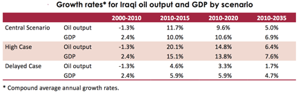 Just having the reserve available is not, however, within the global discussion of Peak Oil, an adequate sufficiency. Because oil well flow declines over time, it is important that the rate of oil production from that reservoir, and the timeliness of its arrival within the supply chain, be considered. This is particularly true in discussions about the help that the reserve will provide in ensuring that there is an adequate supply available when the global demand needs it. Normally, as noted, the decisions about production are made on geologic and economic grounds, but it would be foolish not to recognize that there are other factors. Consider the case of Iraq. It is a common the assumption that Iraqi oil production will rise considerably, with some suggesting it will reach the levels currently only achieved by Russia and Saudi Arabia, although there are some who project it might even rise to as much as 13 mbd, given that there are contracts in place, which if fulfilled on time, would raise Iraqi production four-fold to 12 mbd by 2017.