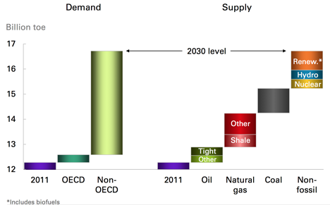 Within that time frame BP expects overall energy demand to grow by 36%, though, as with the ExxonMobil projection, BP expects that a “tremendous increase” in energy efficiency will continue to develop, thereby slowing the need for future resources. They point out that, without this improvement in efficiency, global energy supply will need to double by 2030 in order to sustain economic growth.