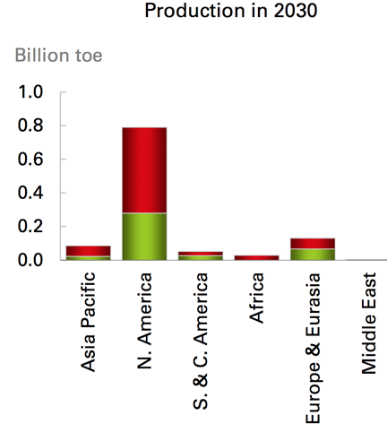 BP see roughly a 7% p.a. increase in shale gas production with most coming from the United States, Mexico and Canada. This will bring total natural gas production to 459 bcf/day by 2030. Of this North America will see a growth in production of 5.3% pa and by 2030 will be exporting roughly 8 bcf/d. In other countries the biggest growth will be in more conventional natural gas production, coming from the Middle East (31 bcf/d), Africa (15 bcf/d) and Russia (11 bcf/d).