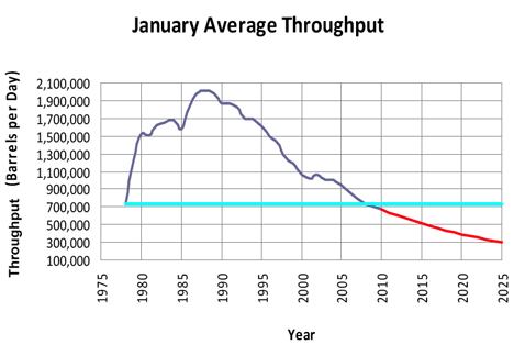 With these concerns on flow rate Alyeska has recently released a report on the consequences of the decreasing flow rates through the pipe, exploring these and other issues in more detail. The greatest temperature effects will occur during the winter months, and in preparing the report they plotted flow rates for January. The following section reviews statements and concerns in that report.