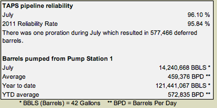 In July of this year TAPS averaged a flow of 459,376 barrels of oil a day, which is down from the average over the past year of some 572,835 bd. And those numbers are becoming something of a concern. For while, in 2010, the pipeline produced about 15% of the national domestic production, the pipeline requires a certain flow level it is to effectively deliver oil.