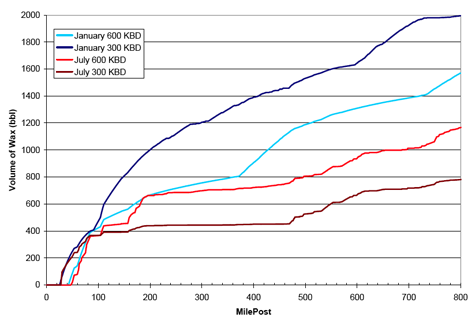 At flow rates above 350 kbd much of the wax scrapped off the wall is assumed to be carried away by the faster moving oil, but at 350 kbd the flow may be insufficient and the wax may then agglomerate and build up in front of the pig.