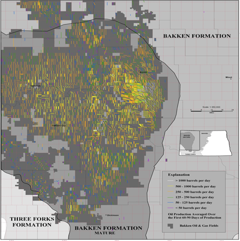 Figure 2. Location and production values for wells in North Dakota (Department of Mineral Resources)