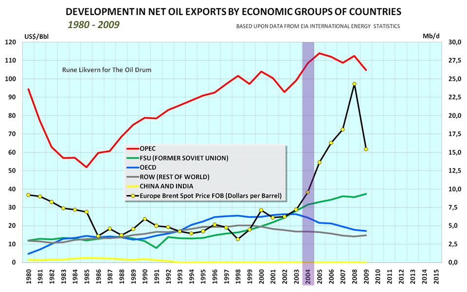 The stacked columns show development in net exports of all liquid energy split among OPEC, FSU (Former Soviet Union), ROW (Rest Of World), OECD and China+India from 1980 to 2009. The development in the annual oil price is plotted against the left hand y-axis.