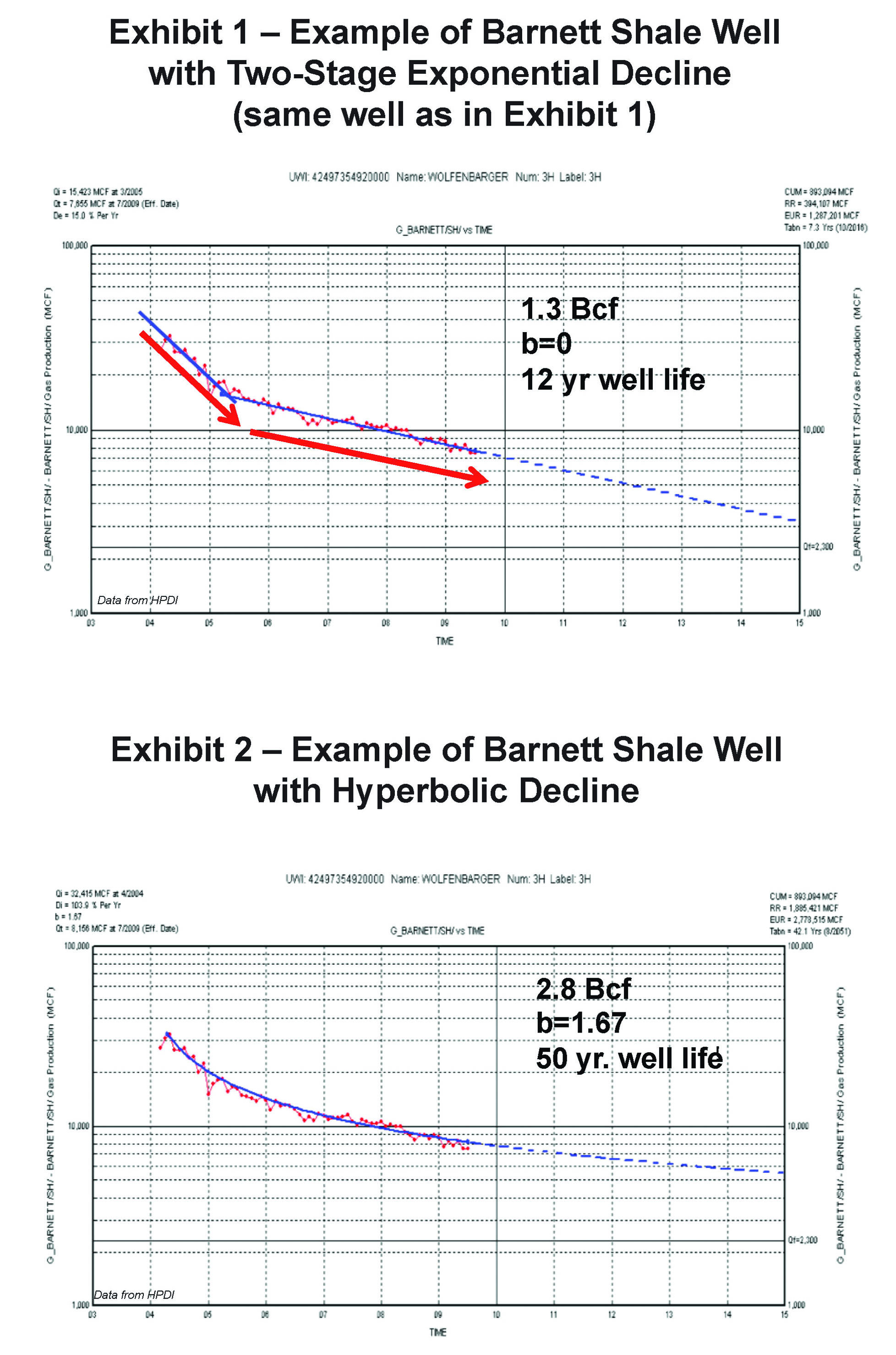 Two-stage exponential decline is characterized by an initial ten- to fifteen-month period of steep decline followed by a stable, shallower rate of decline that continues up to the present life of wells (commonly for four or more years to date in the Barnett Shale). Our emphasis is on matching the relatively stable, shallower stage (Exhibit 1) because that is the portion of the decline history that best predicts future performance.