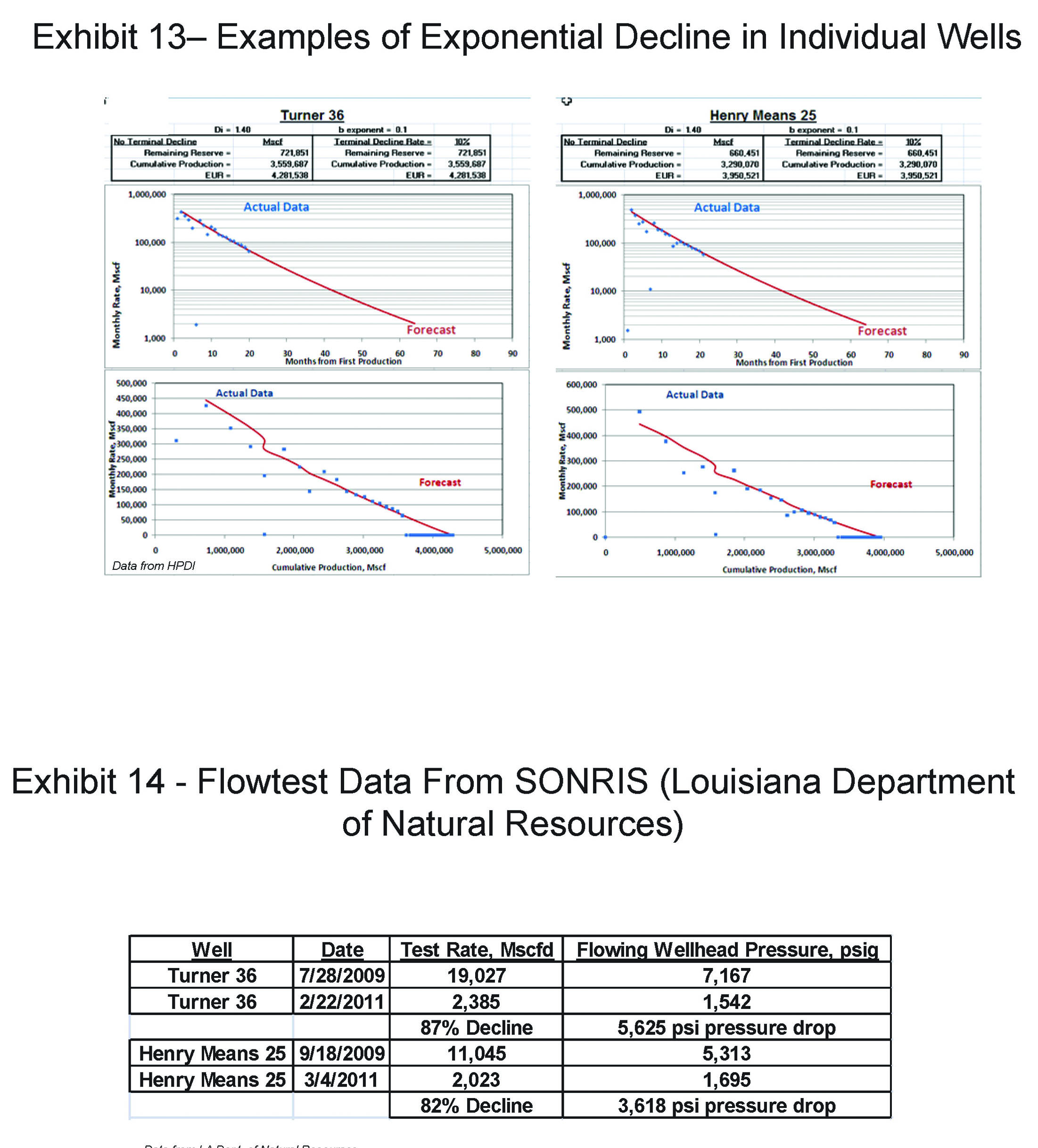 A more important difference between results from this study and operator presentations is the long-term decline behavior of the wells. In multiple studies we have analyzed several thousands of individual wells in the Barnett, Fayetteville and Haynesville plays. Most wells are characterized by stable, exponential decline trends after the first year of steep decline, as previously shown in Exhibits 10 and 12. Additional individual well decline examples are available on request in presentation format for 118 Haynesville wells included in the individual vs. vintaged group average decline comparison shown in Exhibit 15.