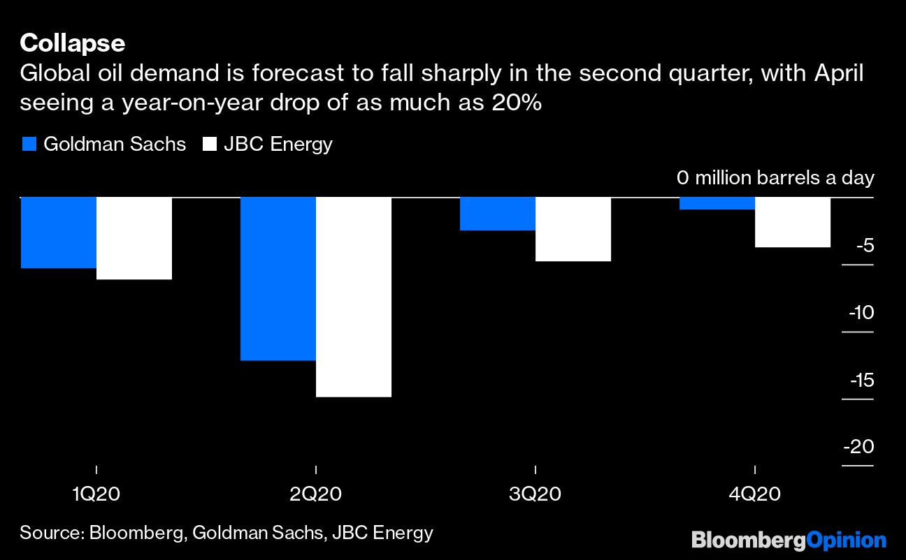 The pumping free-for-all unleashed by Saudi Arabia and Russia is important for the long-term shape of the oil industry, but, as my colleague Javier Blas  pointed out here, it’s a sideshow to the havoc being wrought by the lockdowns crippling economies worldwide in response to the coronavirus pandemic. Forecasts of a catastrophic drop in oil demand abound, with estimates of a whopping 20% year-on-year reduction in global consumption in April becoming more common. That’s 20 million barrels a day, equivalent to the entire consumption of the United States.