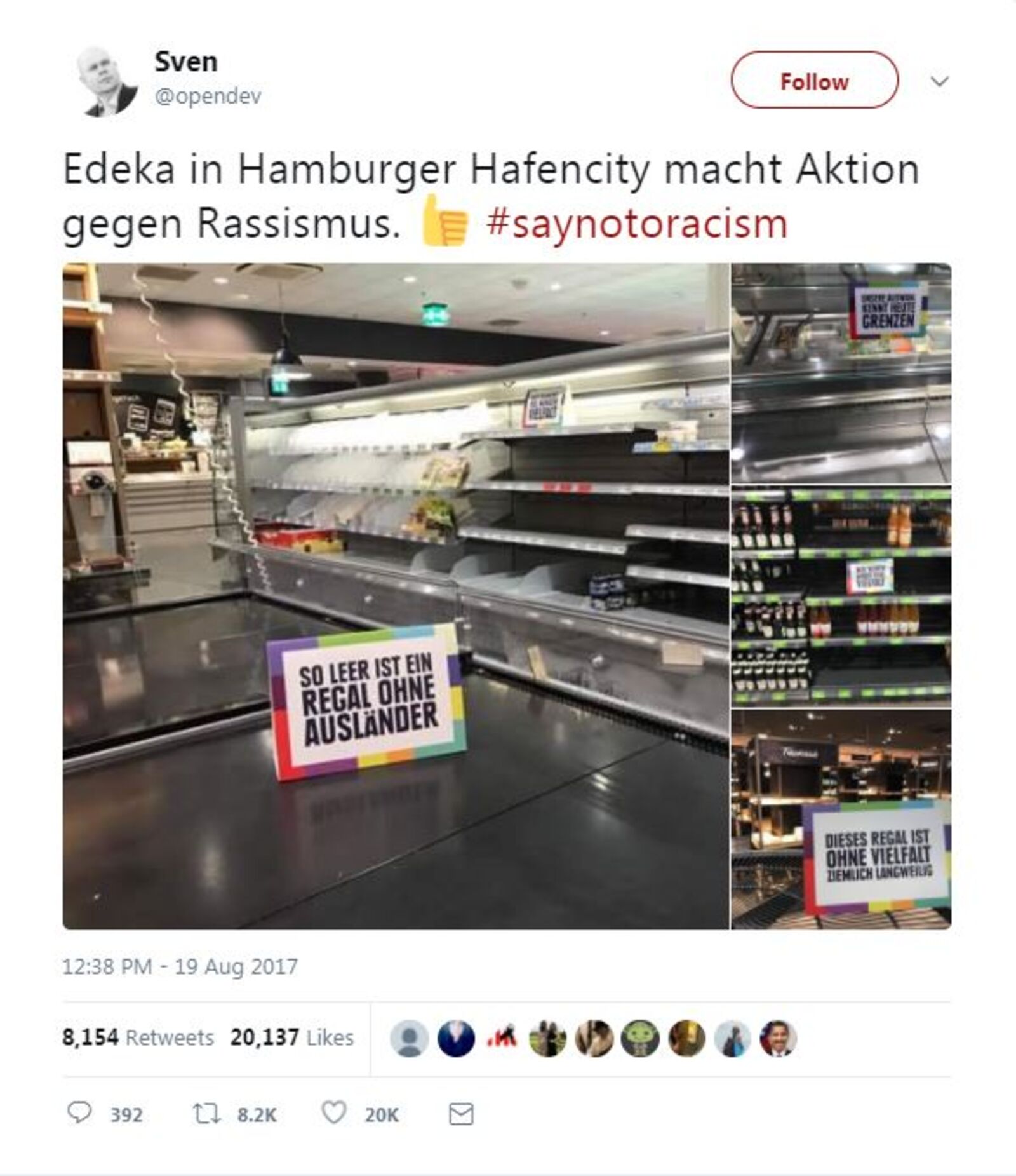 And finally… “This is how empty a shelf is without foreigners” and “We will be poorer without diversity.” The stunt by Germany’s largest supermarket chain, Edeka, is making the rounds on social media today, serving as a reminder that liberal values persist: both Chancellor Angela Merkel and her main challenger, Martin Schulz, are seeking re-election next month on pro-immigration platforms.