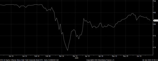 This is exactly what was happening in February as the U.S. economy headed into a recession from government shutdowns. Corporate bond yields began to rise reflecting the increased risk to bondholders as a result of the recession. You can see this in the precipitous drop in the price of the popular junk bond ETF, HYG.