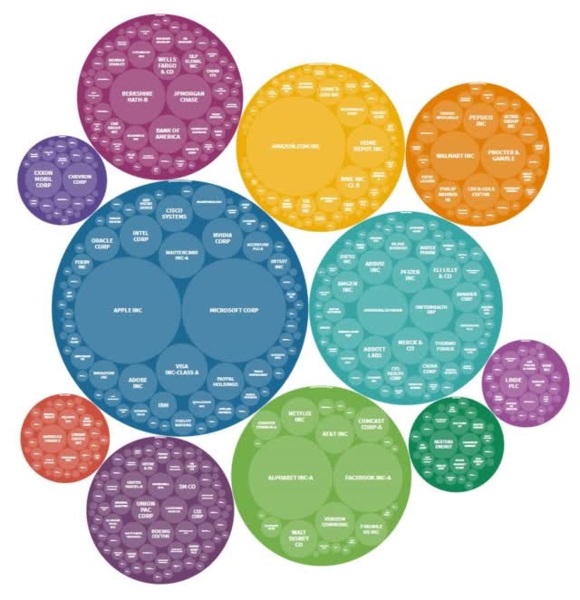 Indexing led to extreme market valuations as the index favored large-cap stocks which drove the indexes higher and higher. The result was most of the index returns were concentrated in a handful of stocks as shown in the graph below (chart of S&P 500 sector and member weights).