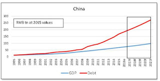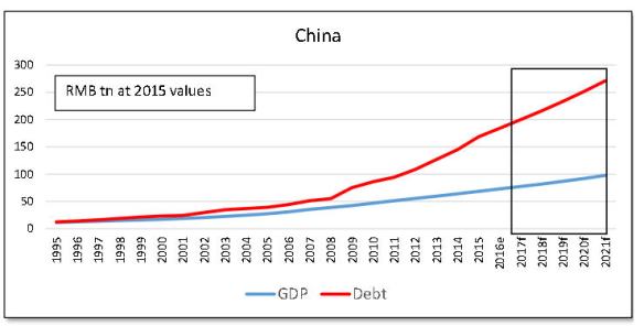 The picture that emerges is quite extraordinary. Over the ten years between 2005 and 2015, GDP grew at rates of between 9% and 14% annually, not even stumbling materially during the 2009 global downturn. But debt has grown by between 17% and 35% of GDP each year, with the exception of 2009, when debt increased by 47% of GDP.